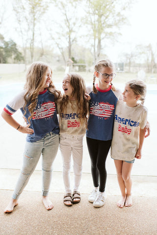 We are thankful to live in a country with the freedom to dream! Dress your girl in this fun graphic ringer tee all year long, on the boat, or to watch the fireworks on July 4th! Want to coordinate with your mini me? This design is available in a matching ladies' style.