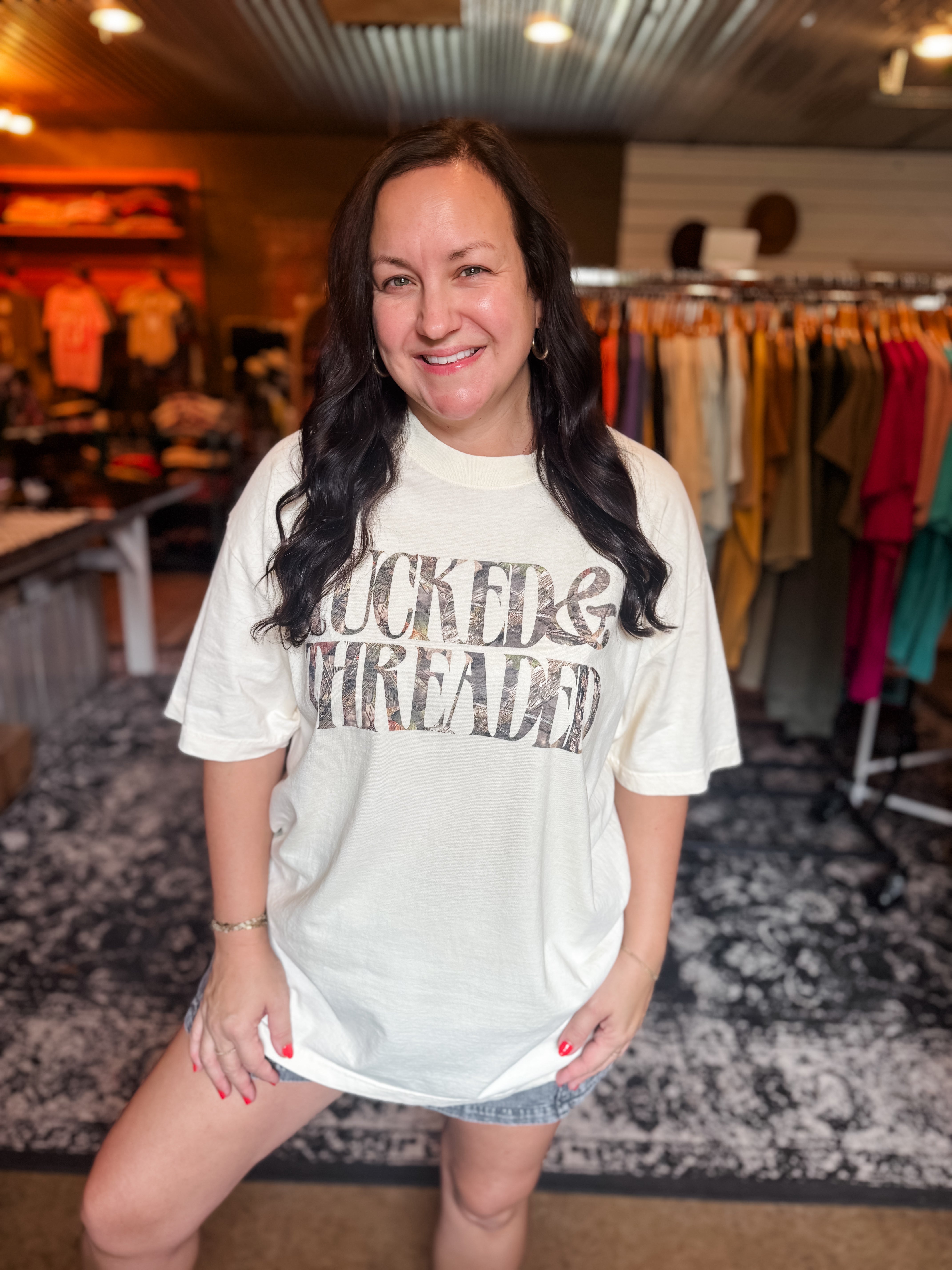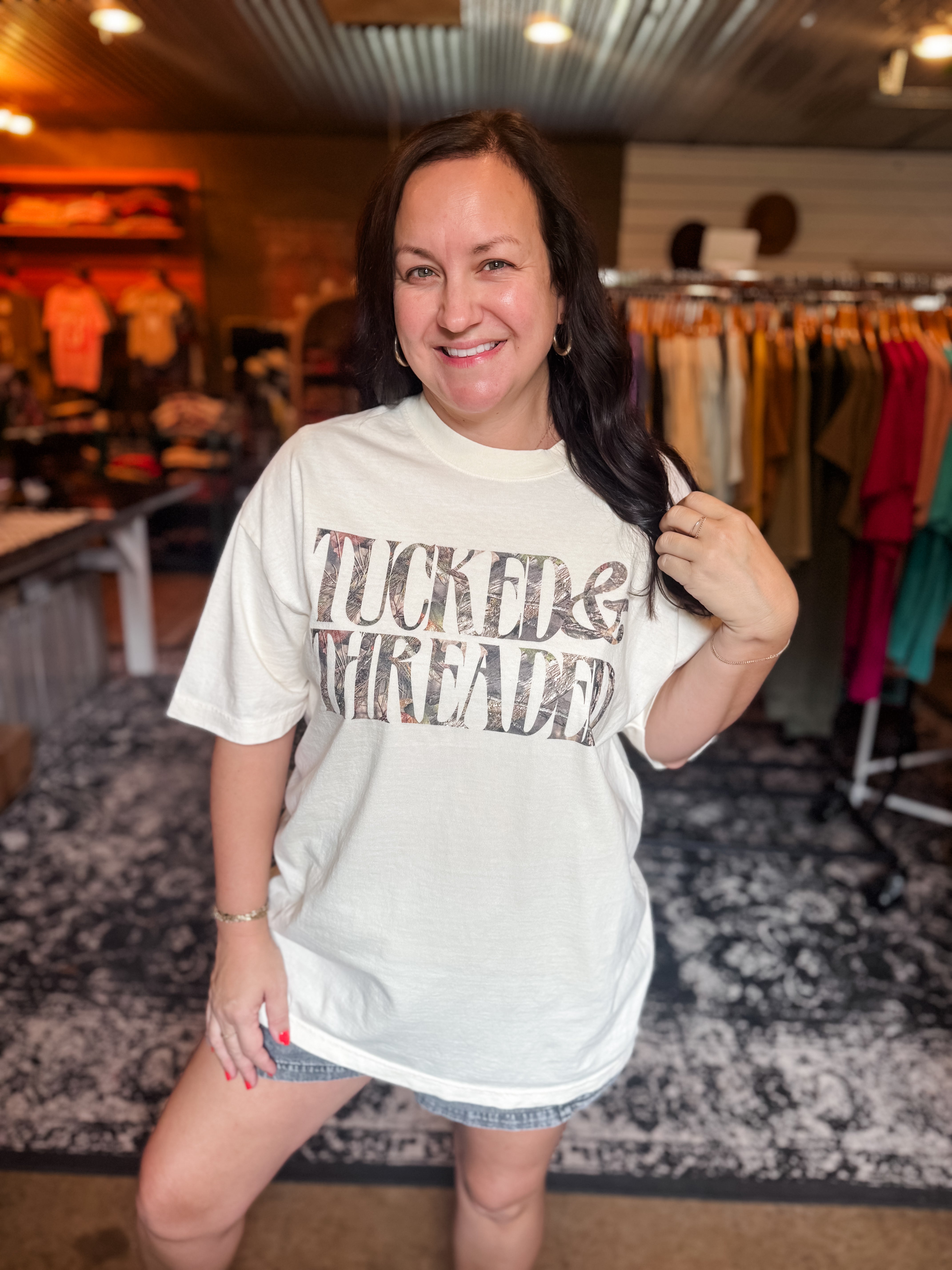 Blend comfort with style in the T+T Camo Midweight Tee from Tucked & Threaded. Featuring the always-popular camo pattern, this tee is crafted from a thicker midweight cotton blend for an elevated feel and perfect oversized fit. Whether paired with denim, layered under a jacket, or styled on its own, it’s a versatile boutique staple your customers will reach for again and again.