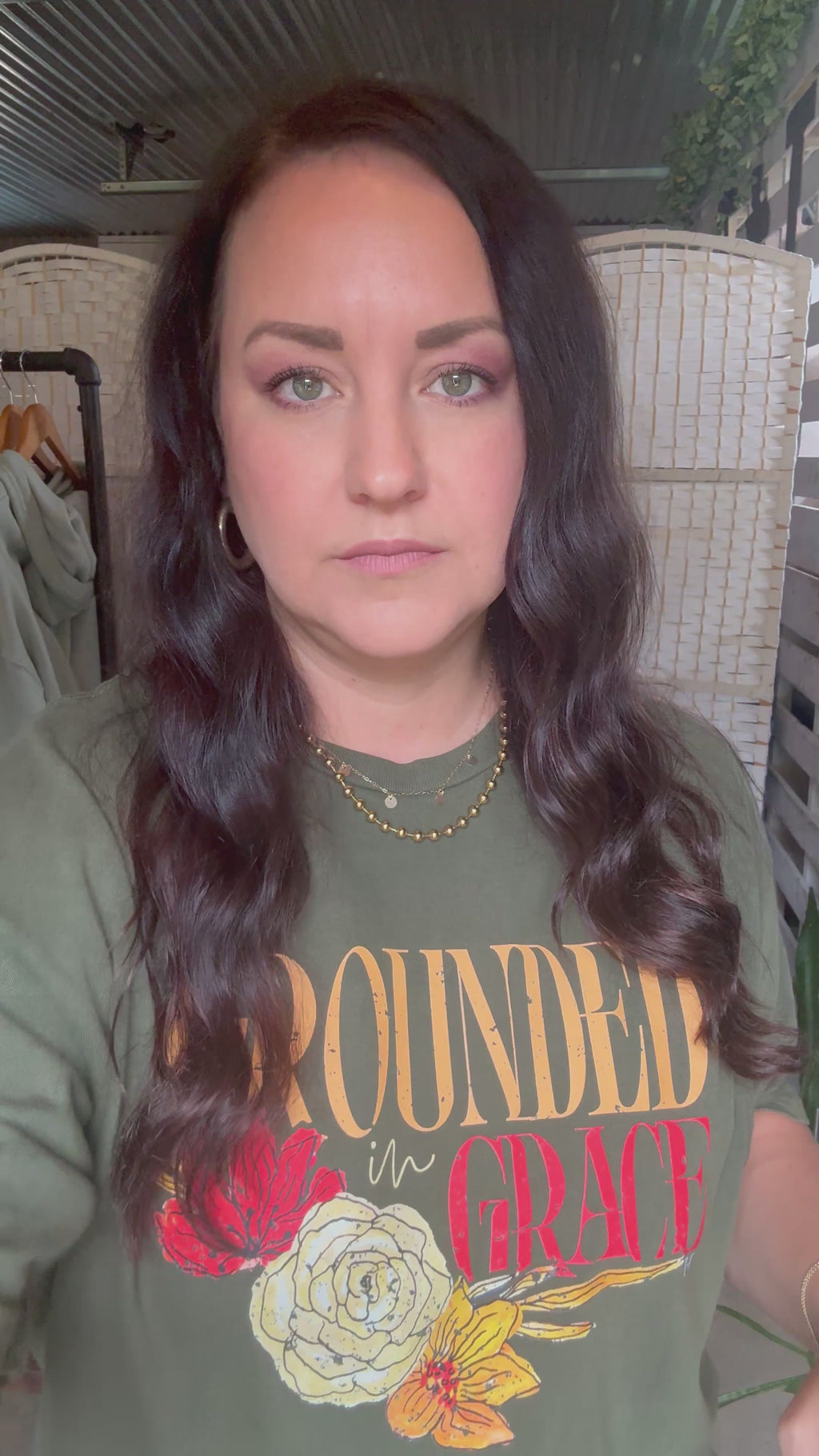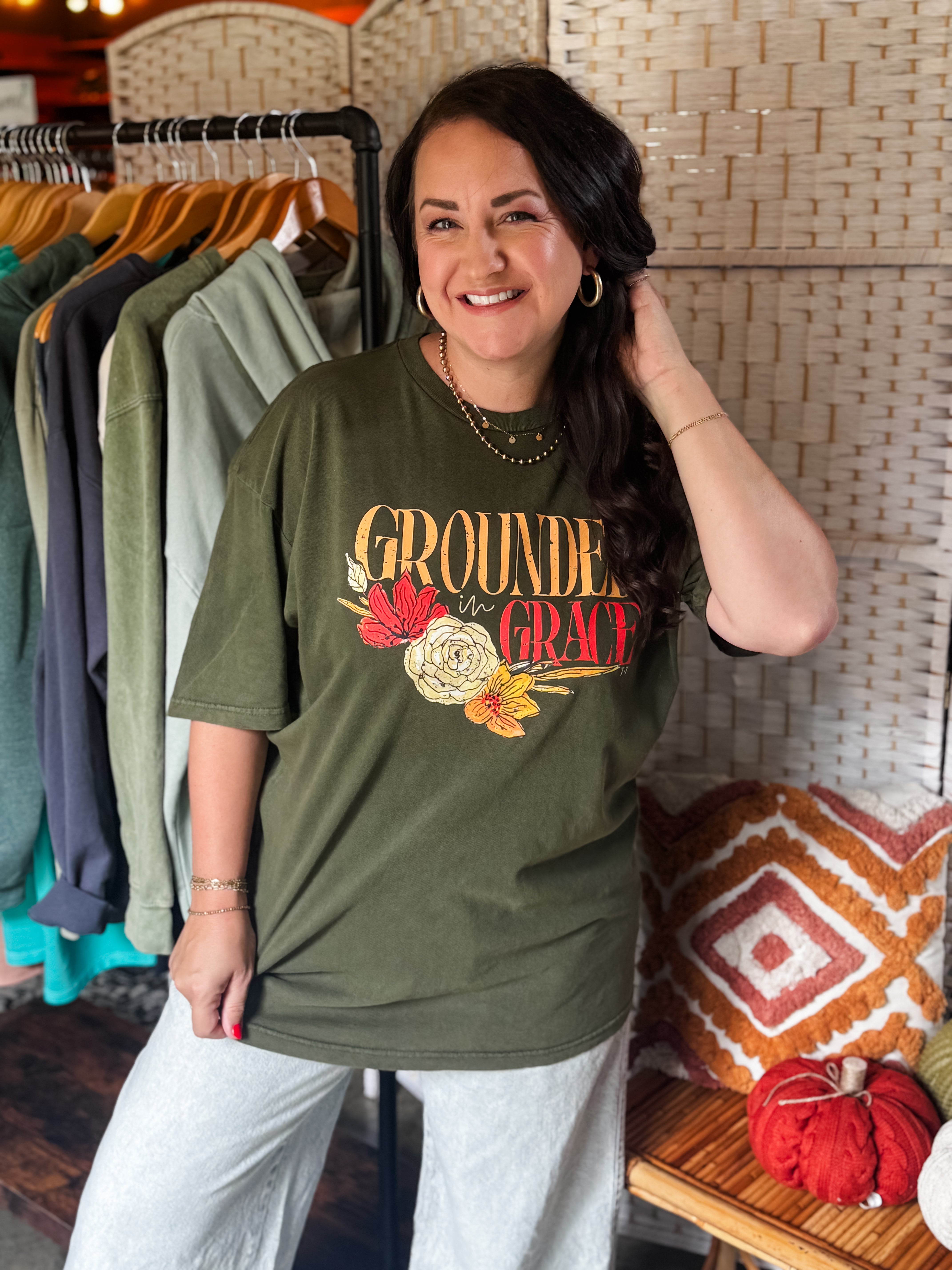 This faded wash olive tee blends meaningful message with effortless style. Featuring the phrase “Grounded in Grace” across the chest, this piece is designed to inspire calm, strength, and quiet confidence — wherever life takes you.
