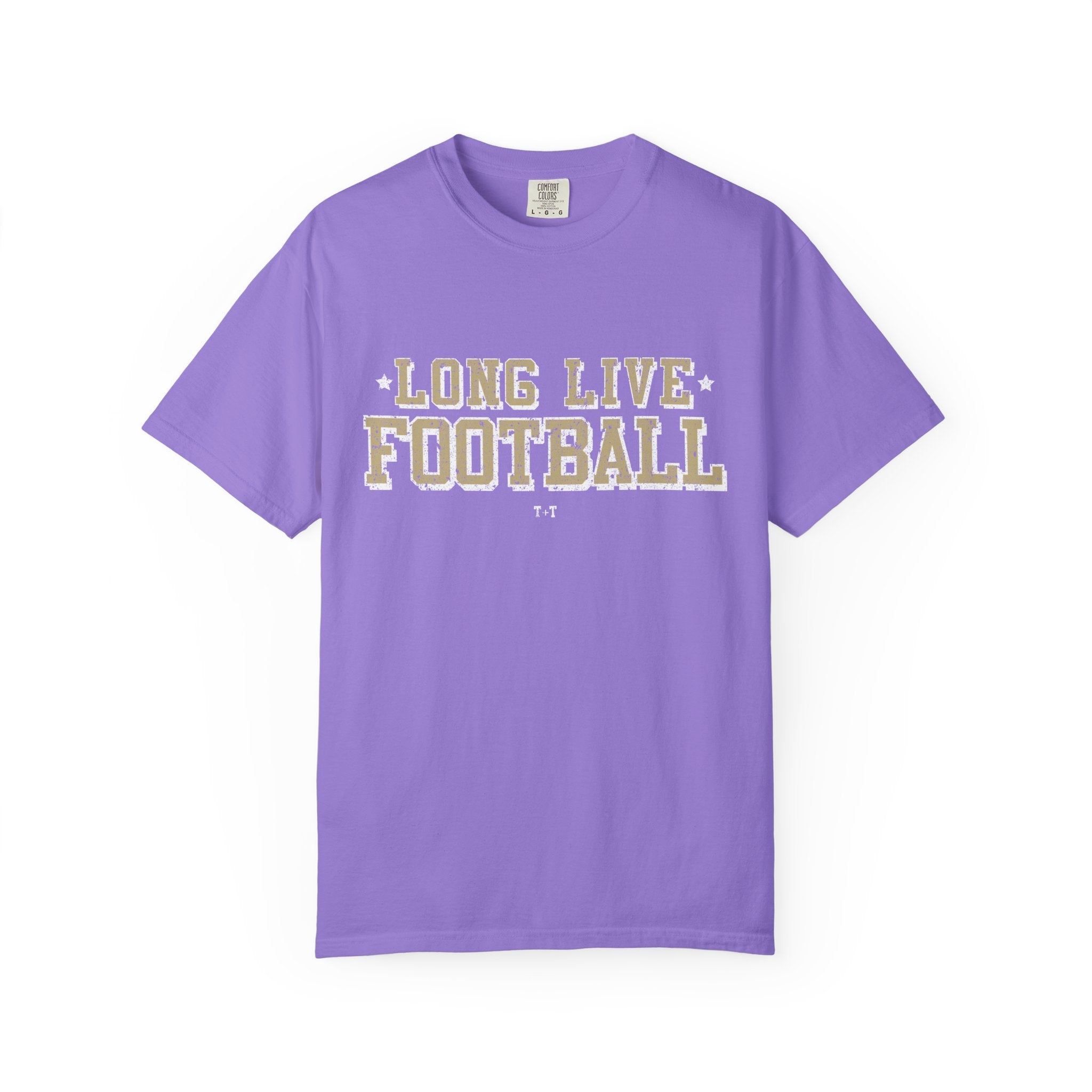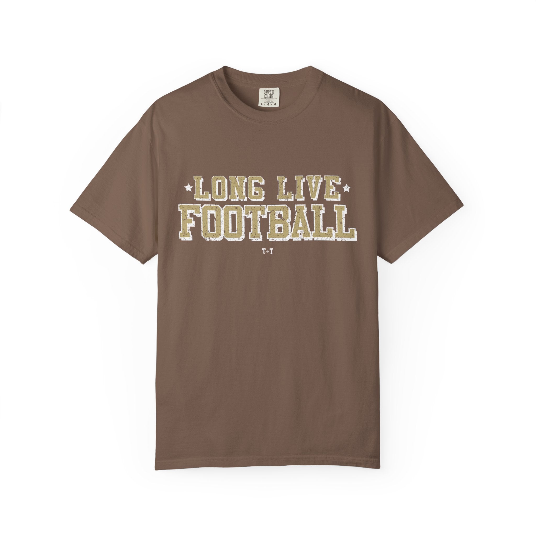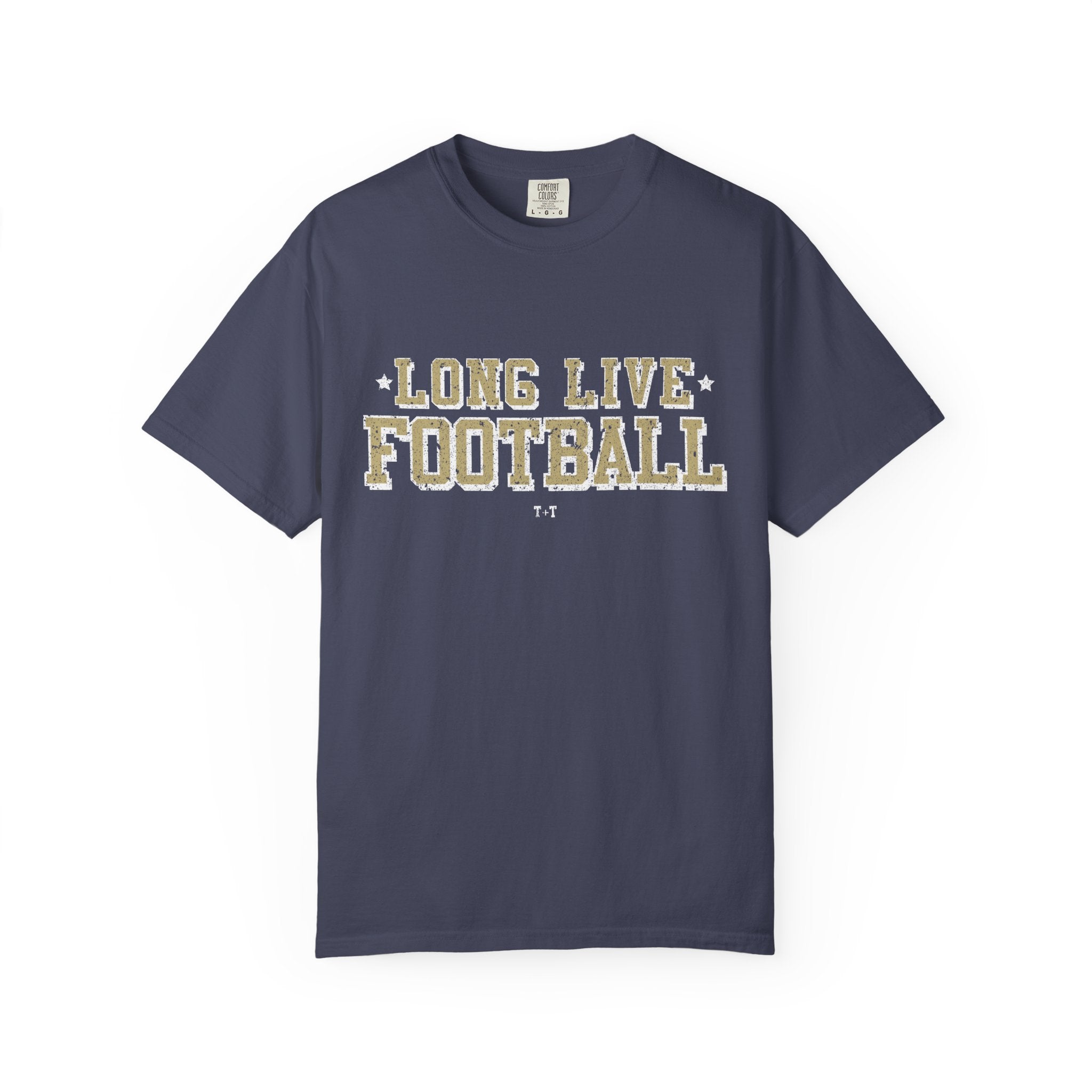 Because football isn’t just a season; it’s a lifestyle. The “Long Live Football” tee is here for every fan, every Friday night light, every game day tradition. Offered in a wide range of colors so you can rep your team without sacrificing style. This desing is printed in gold and white ink.