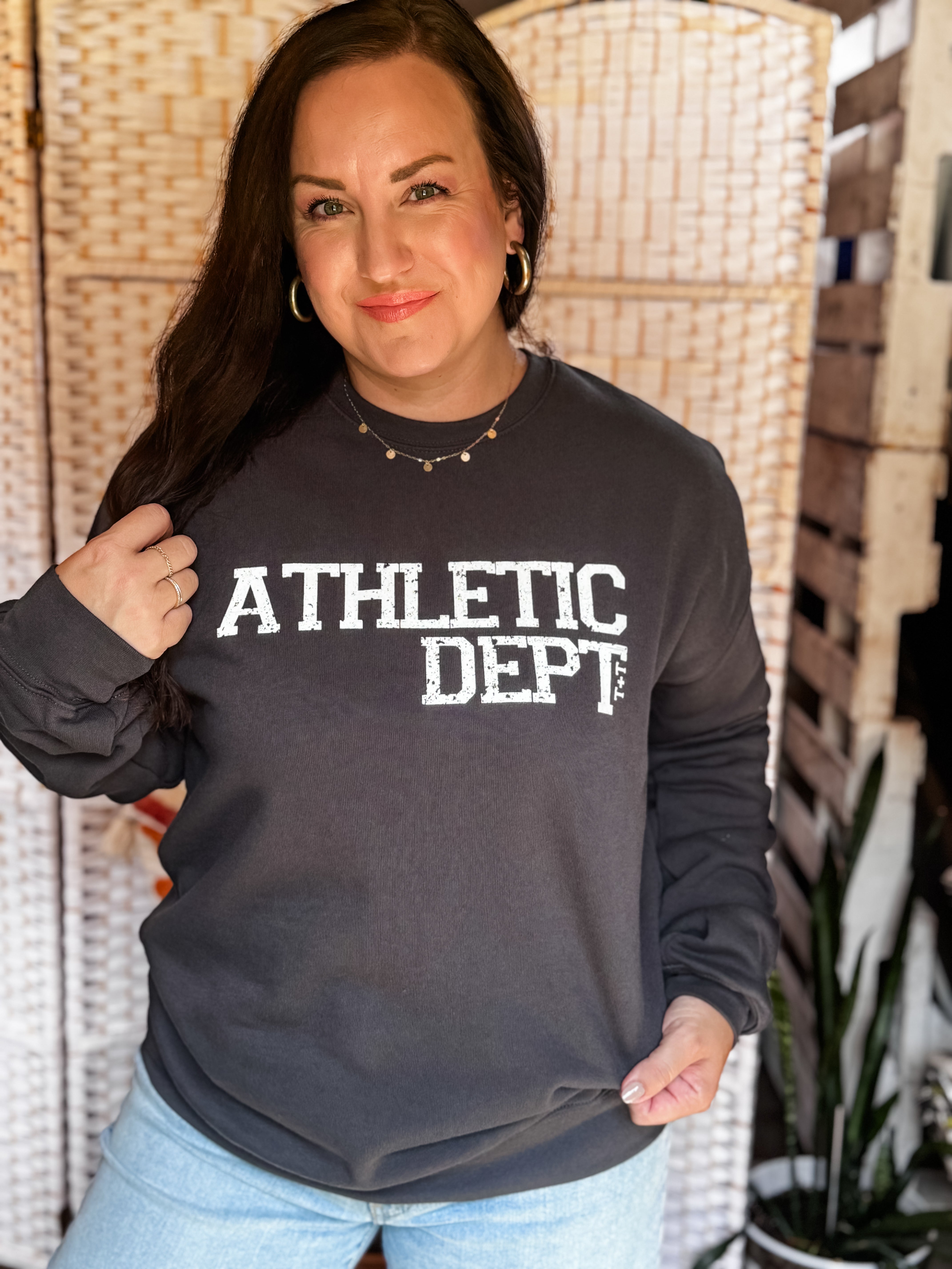 Elevate your game day look with our Athletic Dept. graphic sweatshirt in a dark grey color — where comfort meets cool. This laid-back cozy, but classy features bold varsity-inspired lettering, giving you that effortless athletic aesthetic with a feminine edge.