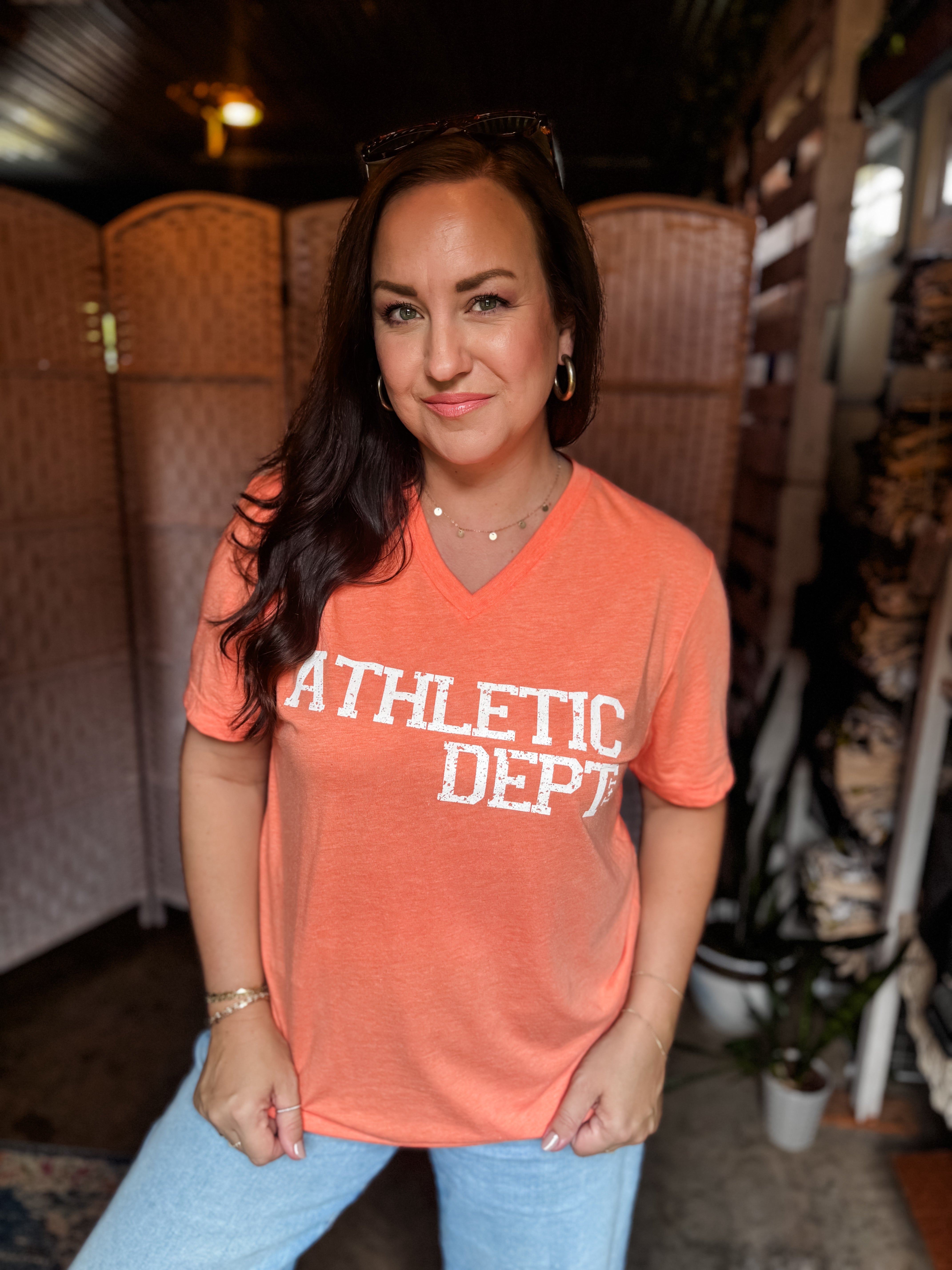 Bring the heat this season with our Athletic Dept. v-neck tee in bold orange color! It's the perfect blend of sporty and casual with the design printed in white ink. Designed for comfort and movement, this soft, flattering tee takes you from tailgates to touchdowns with ease.