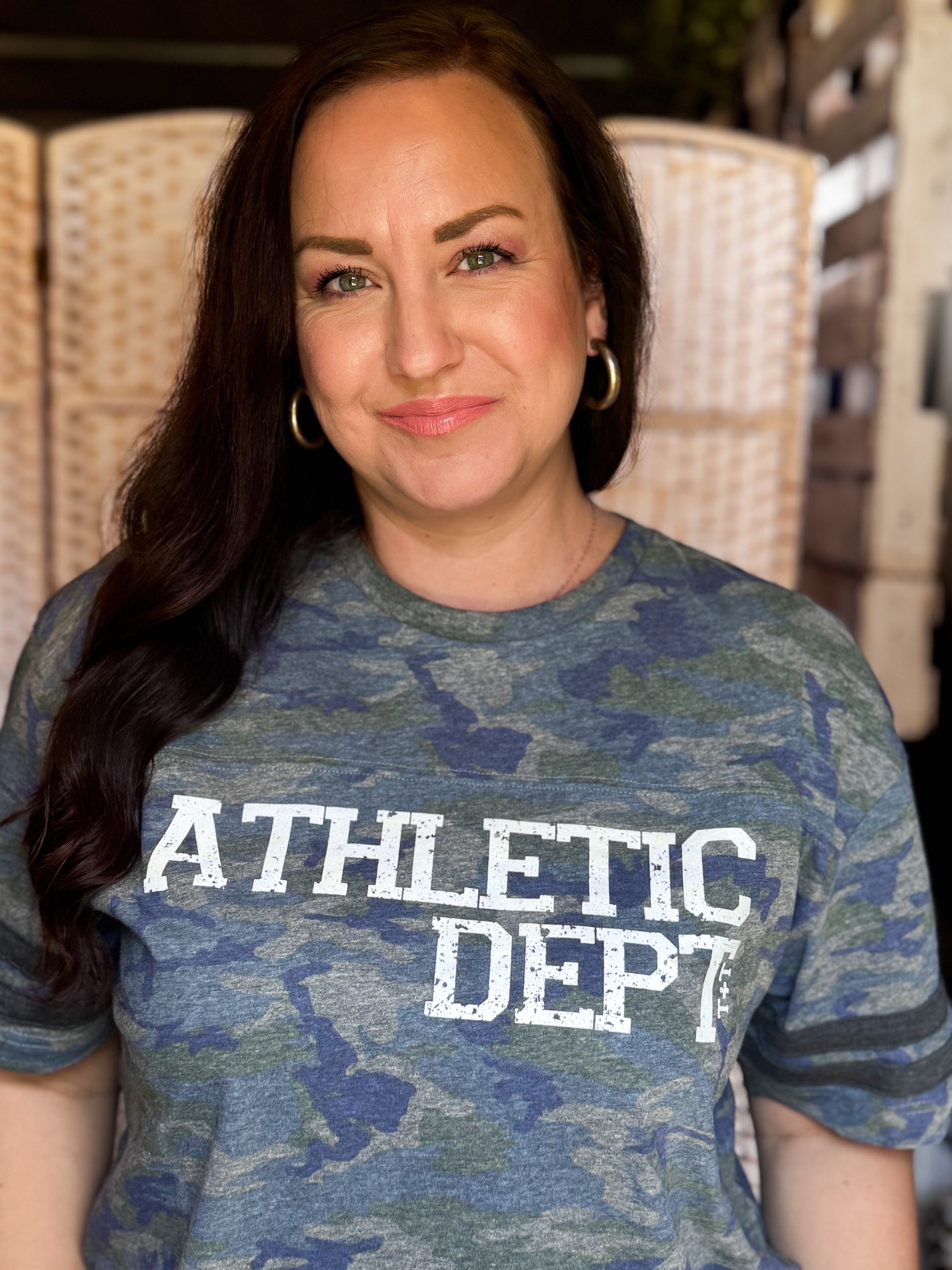 Game day energy meets laid-back camo vibes. The “Athletic Dept” tee brings that effortless sporty feel with a feminine vibe made to move with you from tailgates to touchdowns. Style it with biker shorts, jeans, or layered under your favorite flannel. Whether you're in the stands or on the sidelines, you're always part of the team.