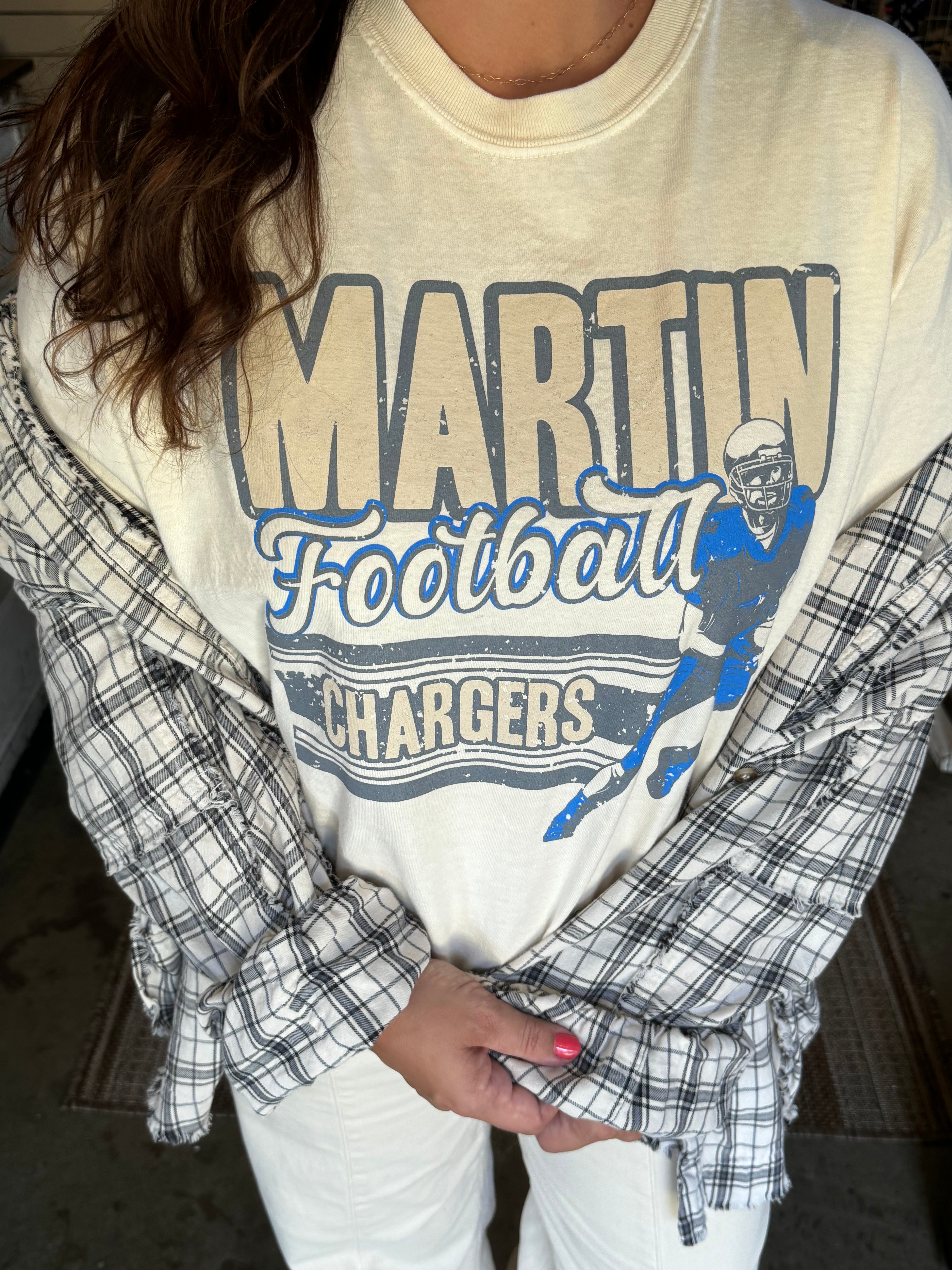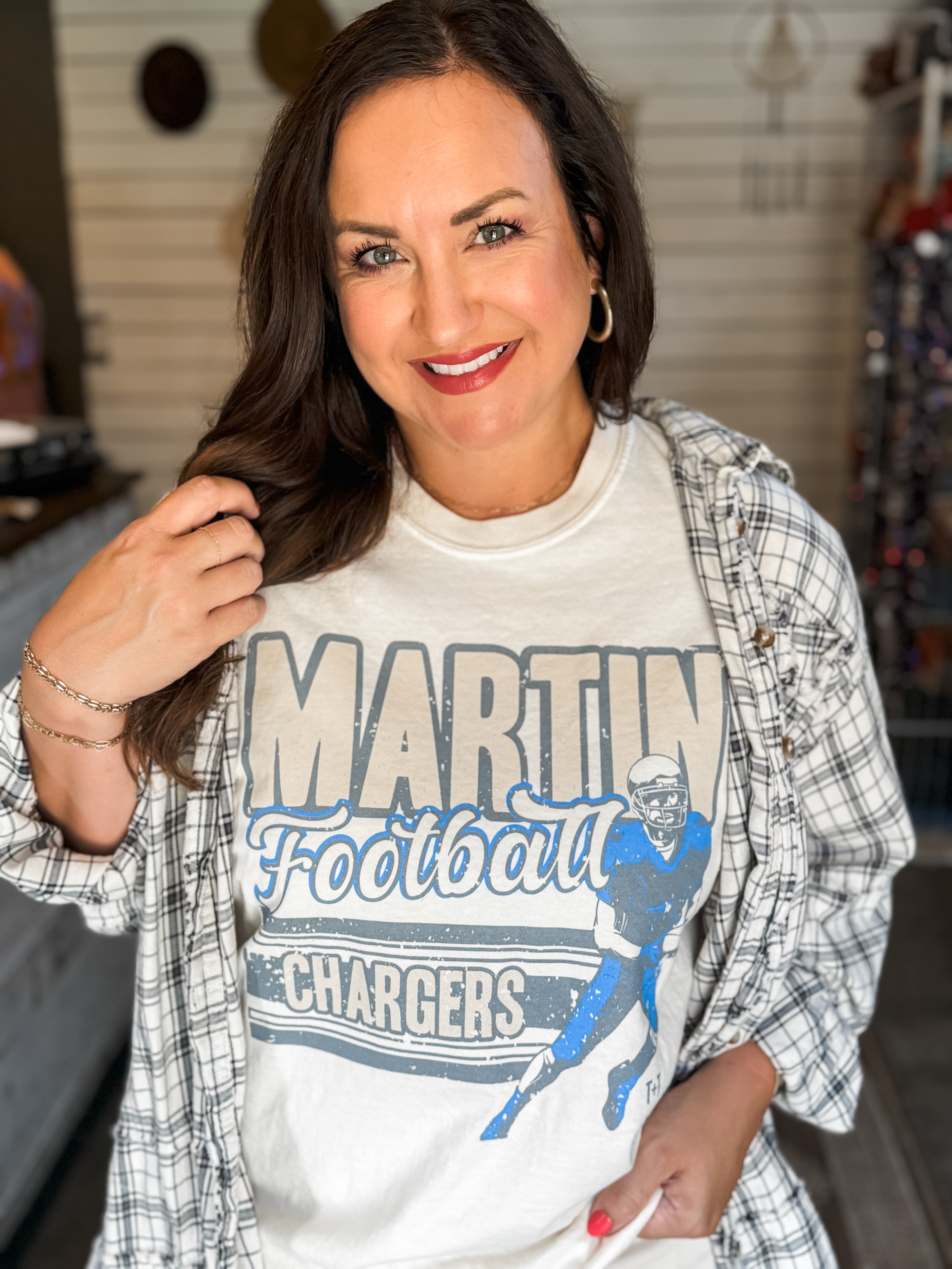 Maegan Jolley has created the must-have design for Fall football! We wanted to add a vintage look and feel to this tee so you are comfortable and stylish while cheering on the Chargers!
