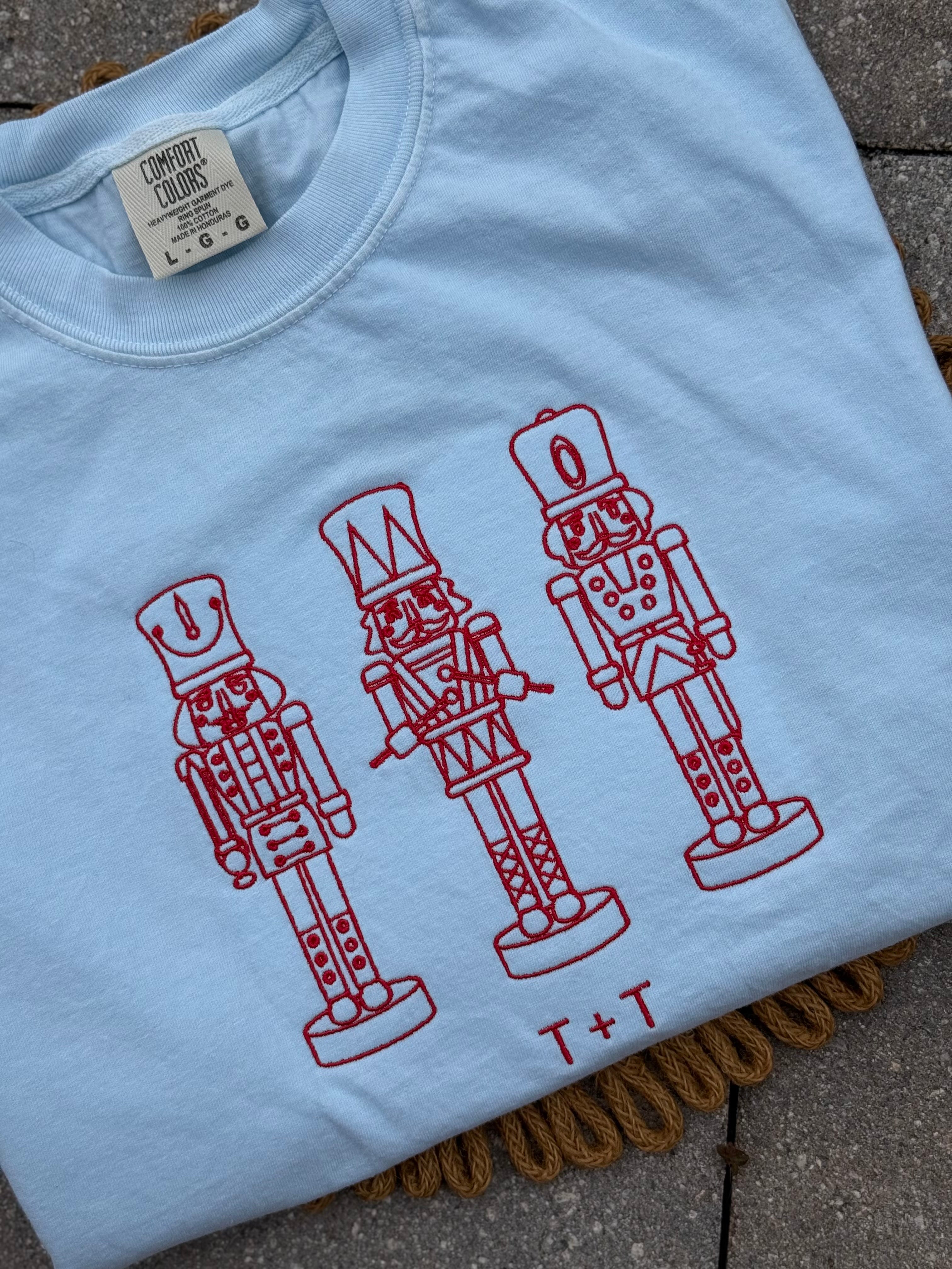 Bring the magic of Christmas to your wardrobe with our Chambray Nutcracker Embroidered Tee ✨ This soft, mineral-washed sky blue tee features three detailed nutcrackers embroidered in red thread — a classic, timeless holiday look without any wording or loud graphics. We are honored to have the added touch of custom embroidery by Jackson & Co. Give them a follow on their Facebook page here!