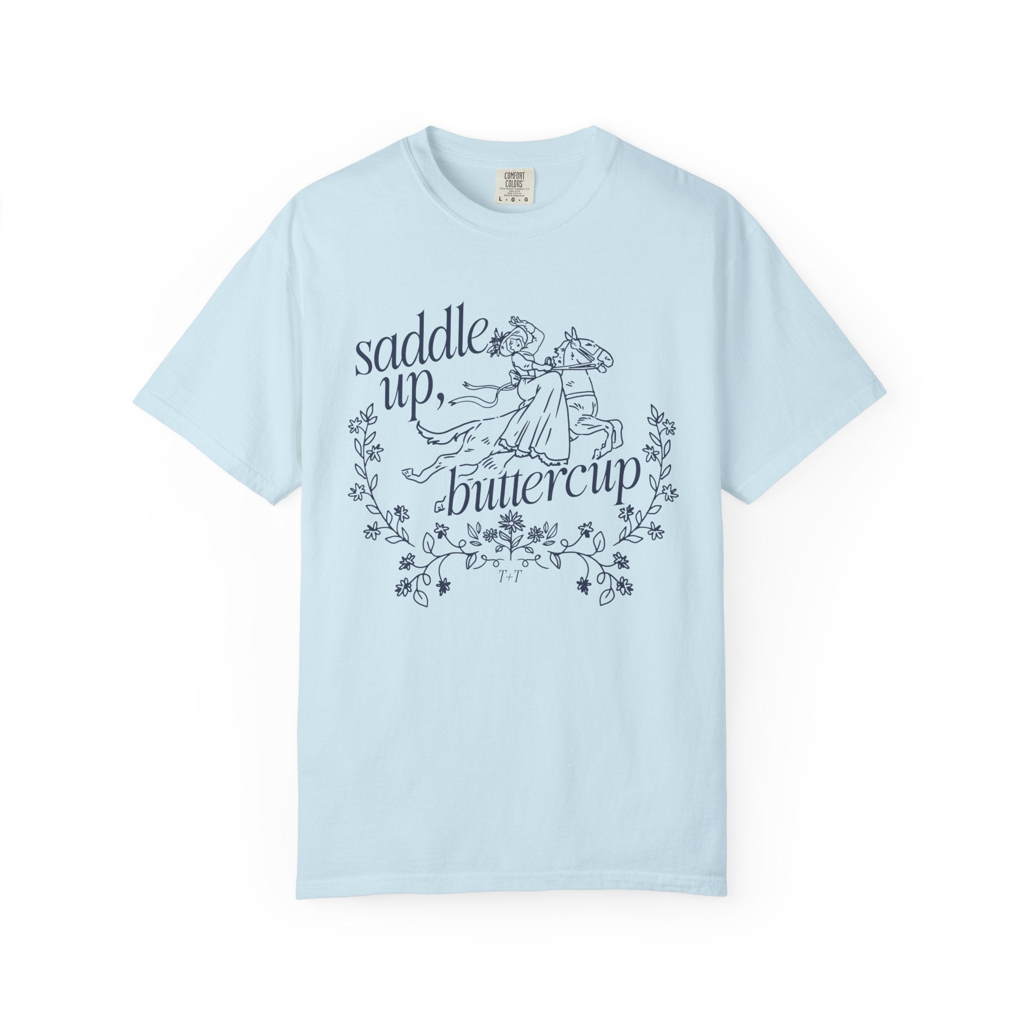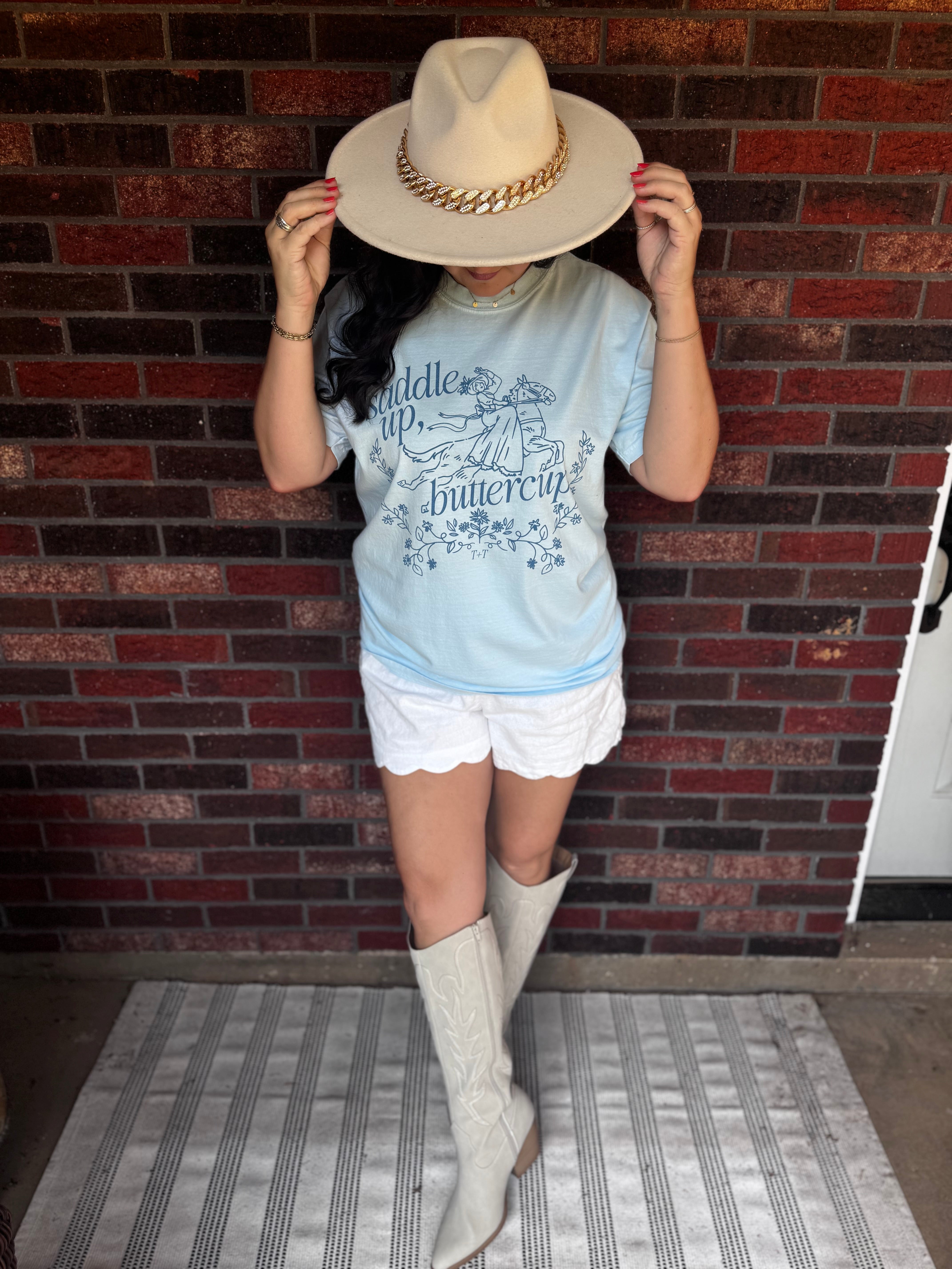 A little sass, a little grit, and a whole lot of yeehaw. This tee features a bold cowgirl graphic and the classic line, “Saddle Up, Buttercup,” reminding everyone you're not here to mess around. Perfect for rodeo nights, country concerts, or just bringing a little Western edge to your everyday look.