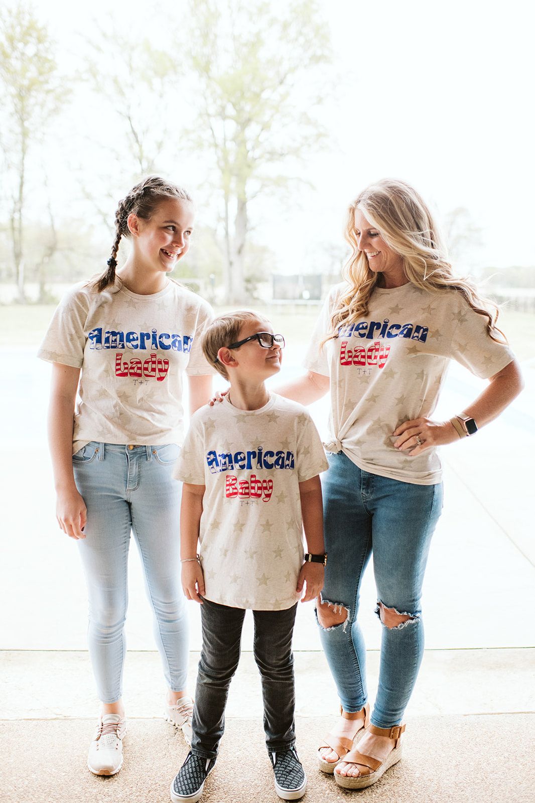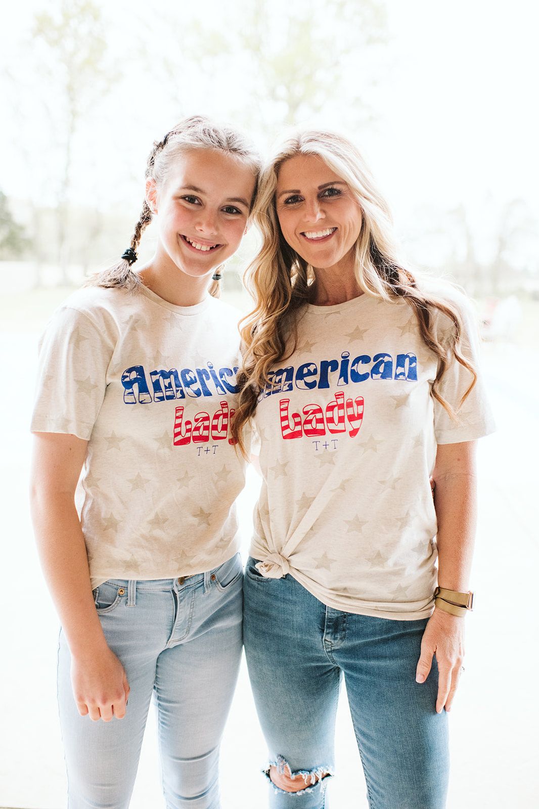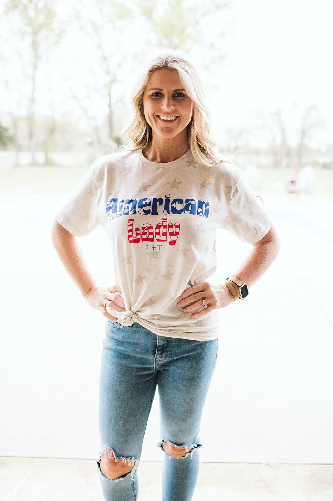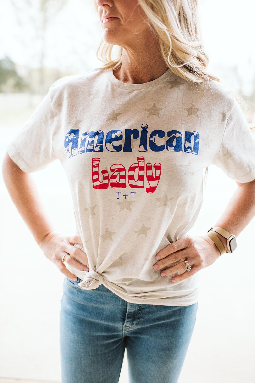 Show off your patriotic side with this fun "American Lady" women's graphic tee! This tee can be paired with your favorite linen pants or comfy denim shorts. You can even coordinate with your little when you purchase our matching "American Baby" Star Tee for kids!